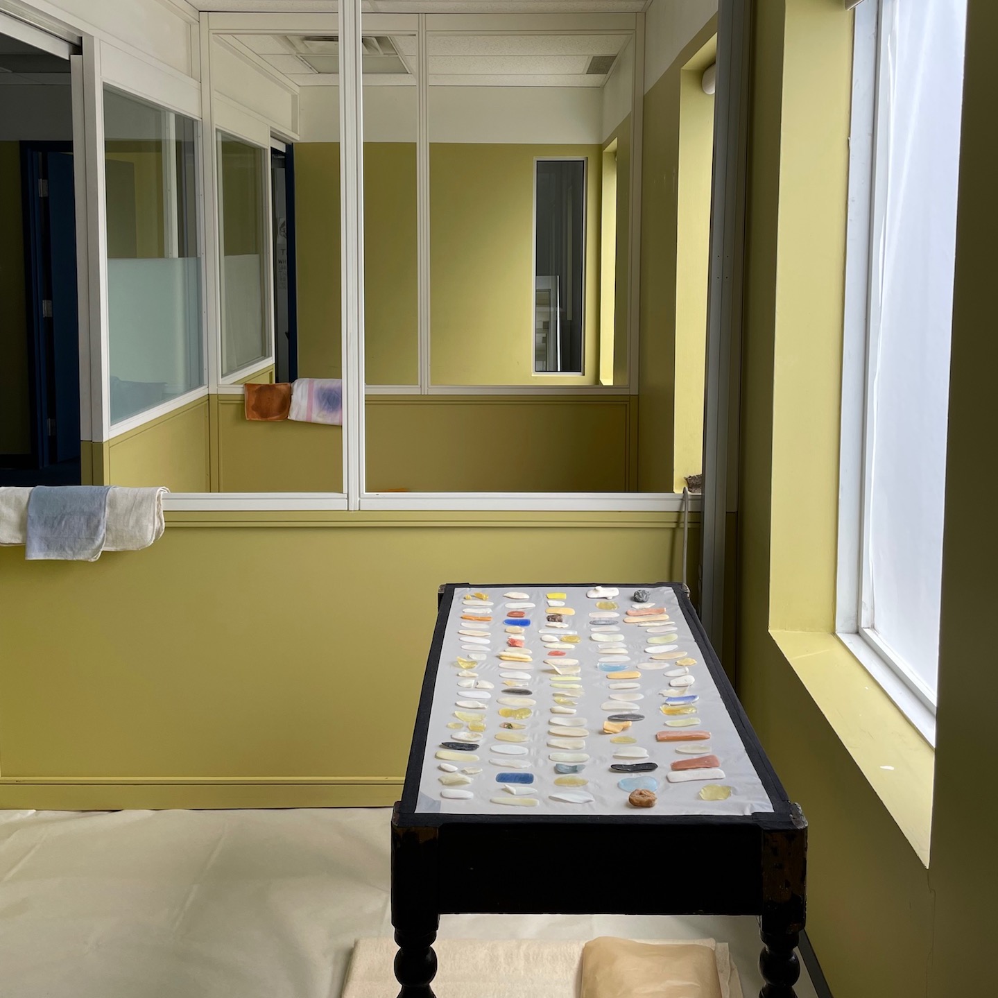 This participatory work was a hybrid of a corporation and a surreal spa, where intimacy was fused with bureaucracy. Upon arriving to the office visitors encountered a sign on the door communicating the rules: be silent, wear a mask, turn off phone, remove shoes, wash hands, and keep distanced from others. A host greeted visitors and opened a closet to reveal a makeshift "sink," assisted them with a hand-washing ritual, then gestured for them to take a seat in the waiting room. They were then given a form listing the offerings, and asked to choose if they preferred their experience to be guided or solitary. Prior to presenting to the public, I took 3 months to slowly inhabit the office. I began by paring down the infrastructure: removing wall dividers, so that just the framework of the cubicles and sliding doors remained. This created the possibility for distinct rooms and yet you could see through them. I covered the windows with translucent paper, obscuring the outside world, yet allowing the daylight to come in. Looking through the row of cubicles towards a mirror in the "Boss' office" there was an uncanny sense of mise-en-abime. Each room explored a particular theme or state of being, and proposed either participation or witnessing. For example in the Conference Room one encountered a round table where puppets were seated. Visitors were invited to animate the puppets, engaging with these paper beings, as well as with other visitors. A sorrowful song played on a loop. In the Soap Room the visitor was guided to lie beneath a table and gaze up at the underside of the soap collection. This sort of meditative state was echoed in the Solarium, where the visitor could sit and absorb the density of plants that filled the humid space. The Kitchen was a sort of laboratory where materials were transformed by staining (inspired by a stain I noticed on a ceiling panel). The Boss' Office was where I would meet visitors for private consultations, which usually consisted of gestural improvisations with magnetized objects. I imagined "The Boss" had sent everyone home during the pandemic and that over time she became more and more undone, following her creative and obsessive impulses. One could imagine that she had eschewed her usual administrative tasks in favour of planting a solarium, staining materials, or gathering yellow objects for a shrine. There was an overall sense of absurdity, yet also a genuine interest in taking care. It was as if for these 9 days she was inviting the outside world inside the office to play.