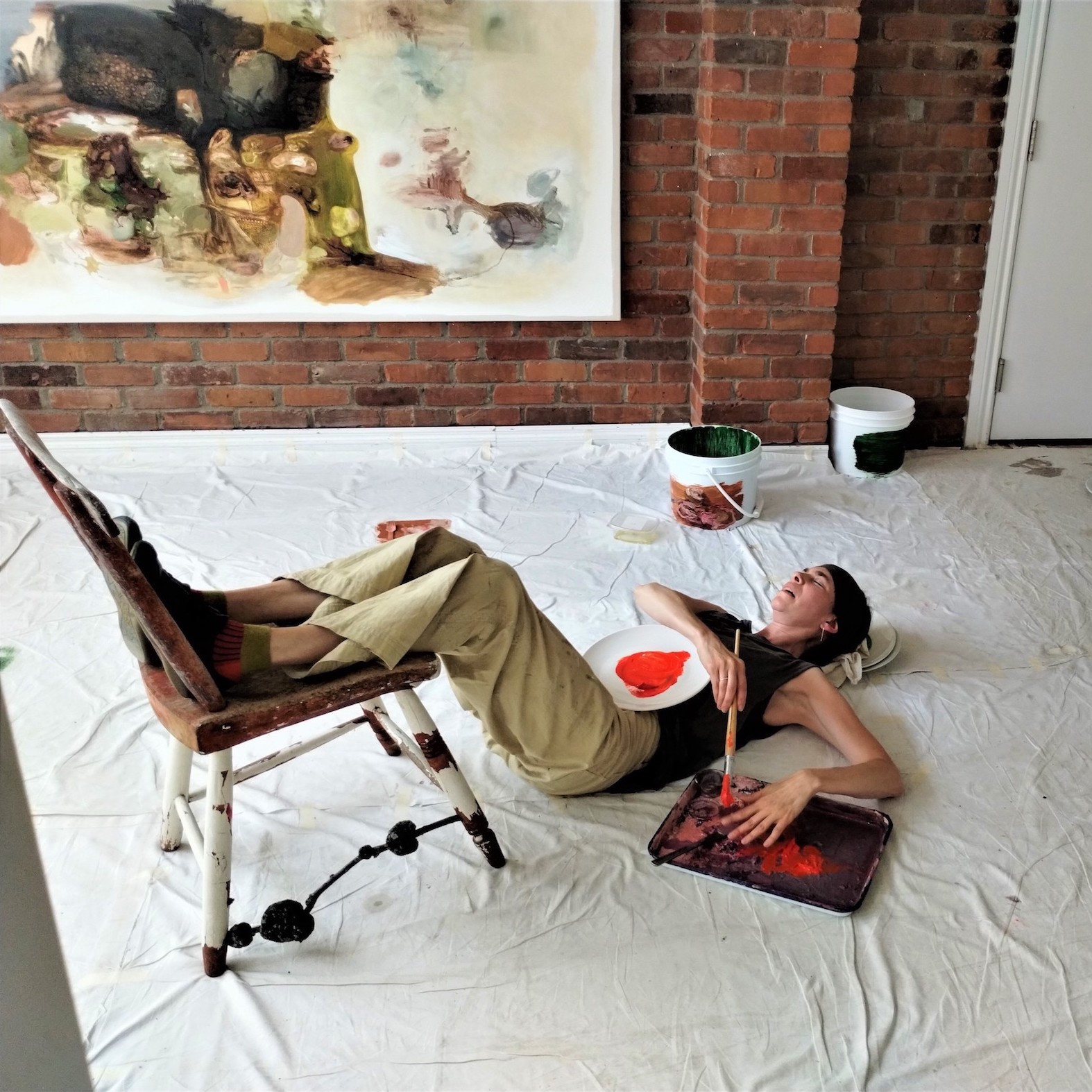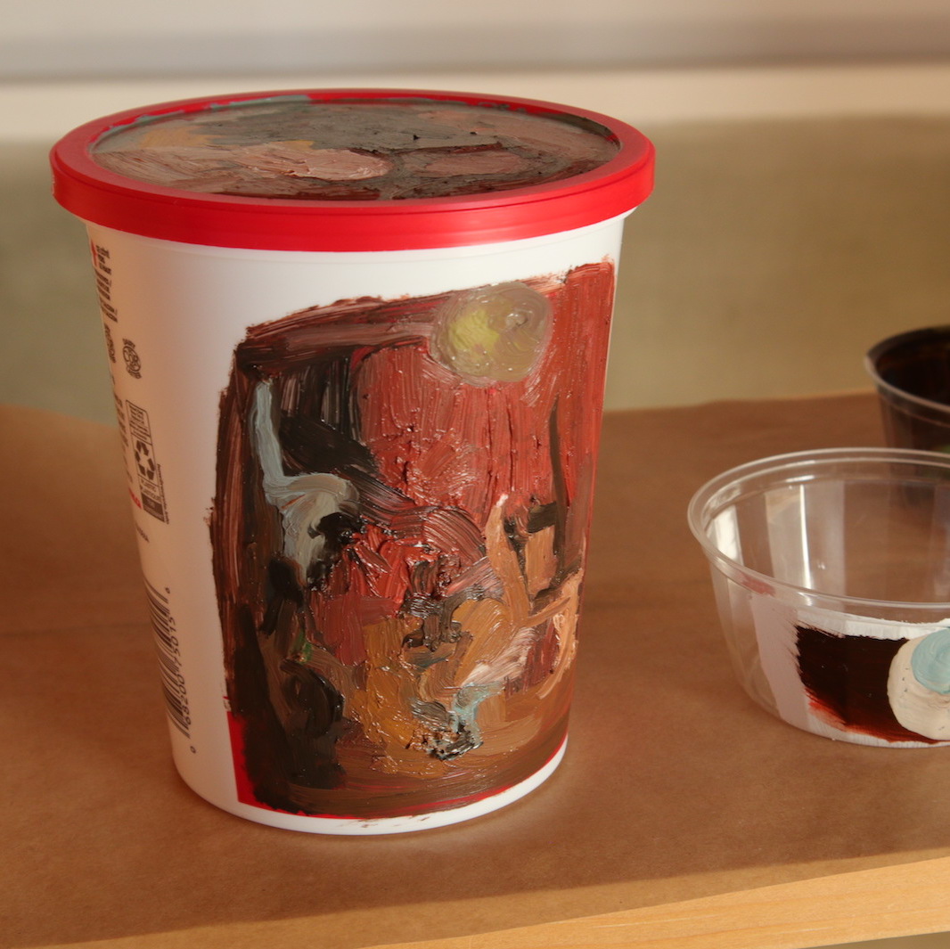 For the first few months I worked in solitude, making large, abstract oil paintings in an improvisatory way. My impulse was to gradually expand beyond the edges of the canvas, to inhabit the residual infrastructure of this corner cafe. I was interested in exploring the slippage between production and presentation, the precious and disposable, the sensuous and unpalatable. Over time I experimented with painting on myriad surfaces, such as china plates, plastic food containers, and buckets discarded from nearby restaurants. The built-in shelves were used to display my "takeout paintings." The installation was then opened to the public and included a series of performances.
